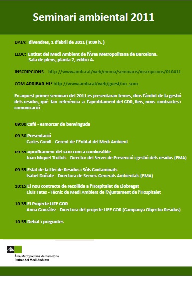 El dia 1 d'abril s'ha celebrat el primer Seminari ambiental d'aquest any. Ha tingut lloc a la seu de l'Àrea Metropolitana de Barcelona, a la Zona Franca, i hi han participat tècnics i tècniques de diferents municipis, així com personal de l'Entitat del Medi Ambient (EMSHTR).
